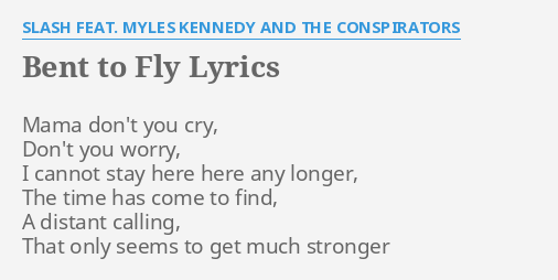 Bent to fly lyrics. Lyrics to Bent To Fly by SLASH. Myles Kennedy and the Conspirators - Bent to fly HD Lyrics iii. Mama Im bent to fly I can feel it coming A perfect storm is rising Gotta say my last goodbye Solo Mama Im bent to fly Mama dont you cry Dont you worry I cannot stay here any longer I wont stop running Im only getting closer To getting off the ground this time The sky is calling The wind is at my shoulders Wont let this chance pass.