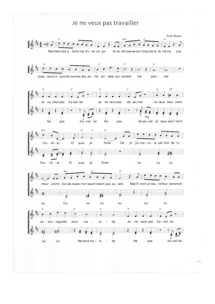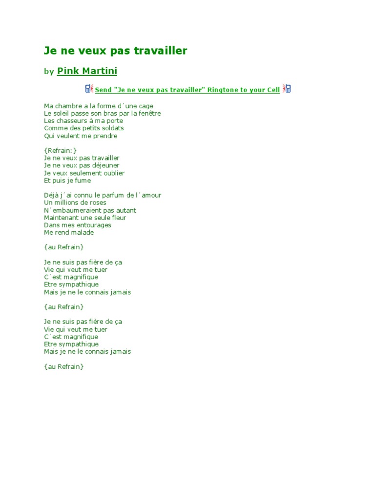 Verse F Ma chambre a la forme dune cage F Le soleil passe son bras par la fenêtre Bb G Les chasseurs à ma porte Comme des petits soldats C Qui veulent me prendre Refrain F Dm Gm C Je ne veux pas travailler F Dm Gm C Je ne veux pas déjeuner F Am Dm Bb Je veux seulement oublier C F C Et puis je fume Verse F Déjà jai connu le parfum. Translation of Sympathique Je ne veux pas travailler by Pink Martini from French to English Deutsch English Español Français Hungarian Italiano Nederlands Polski Português Brasil Română Svenska Türkçe Ελληνικά Български Русский Српски العربية فارسی 日本語 한국어. Écrite par China Forbes et composée par Thomas M.