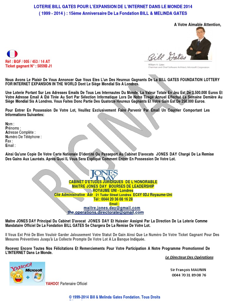 Fondation bill gates loterie is facilities of lottery odds in false lines. Do not offer investment opportunities. ÉVIDEMMENT IL SAGIT DUNE ARNAQUE IVOIRIENNE ou NIGÉRIANE.